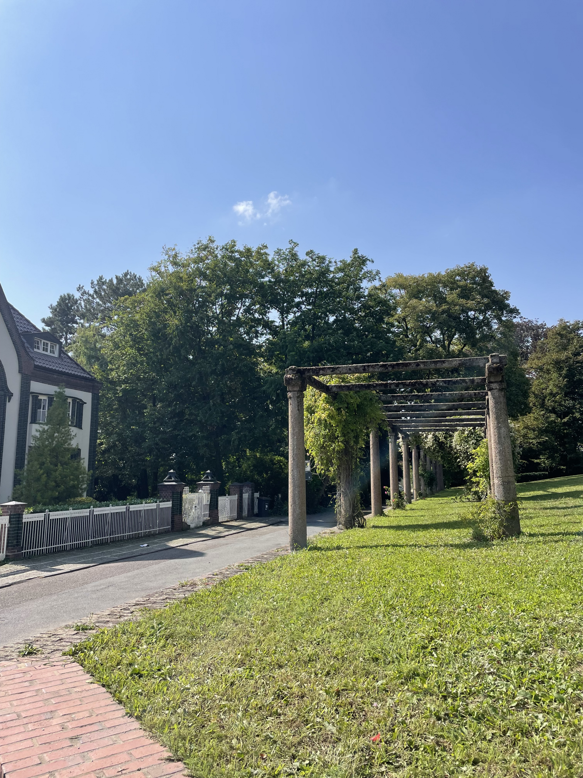 The plot of land between the Gottfried Schwab Memorial and the garden of the Villa “In Roses”, belonging to the painter Hans Christiansen, was created by Albin Müller as an ornamental garden in 1914. The main focus of the decorative garden was on the pergola, which extends along the southern border of the 1914 artists' exhibition and to the side of the lily basin.