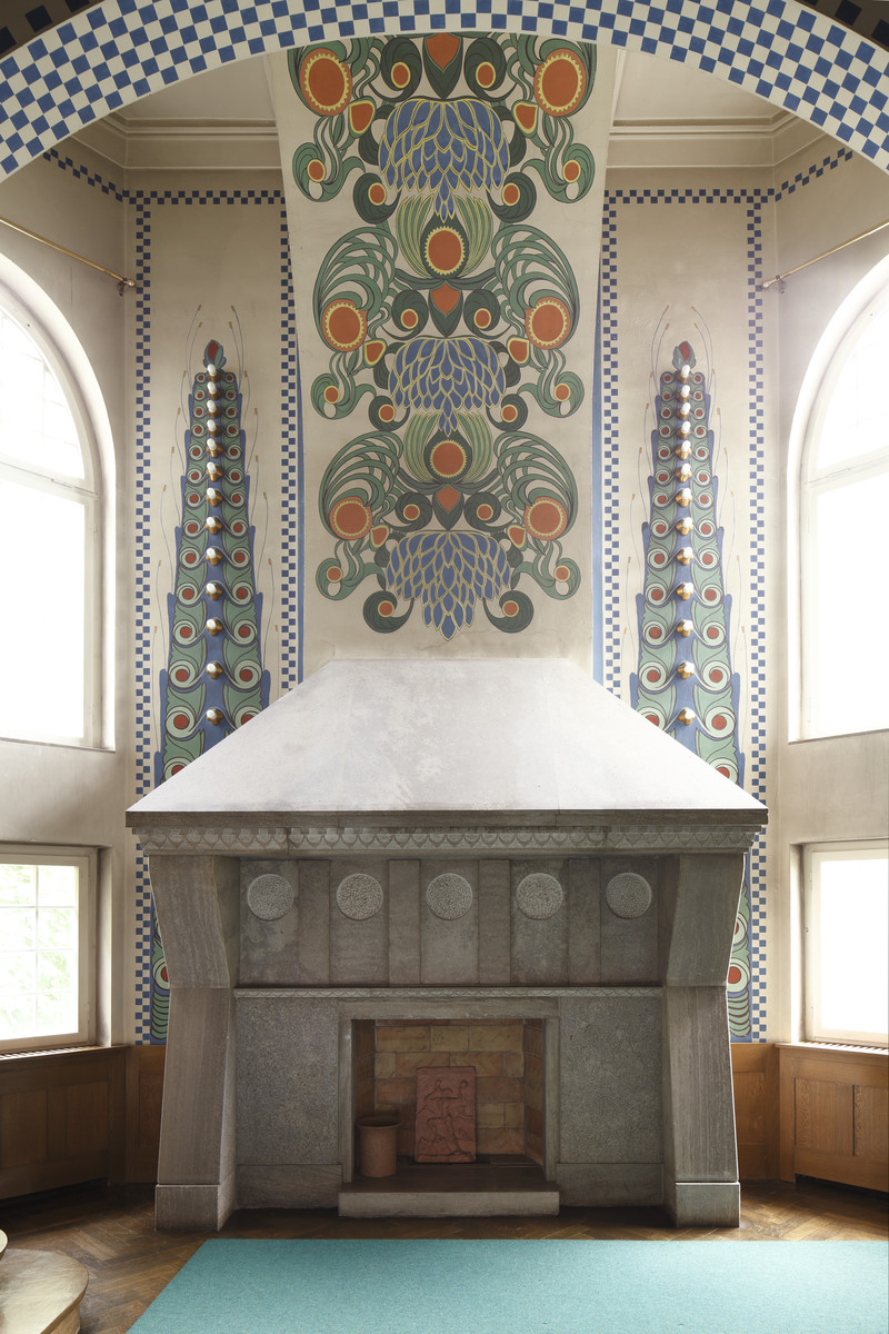 Glückert changed the design of the interiors several times. The final changes were made in the great hall for the 1908 exhibition. Parts of this interior are now on display in the Artists’ Colony Museum.