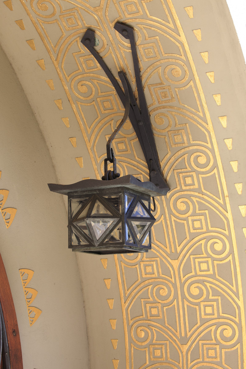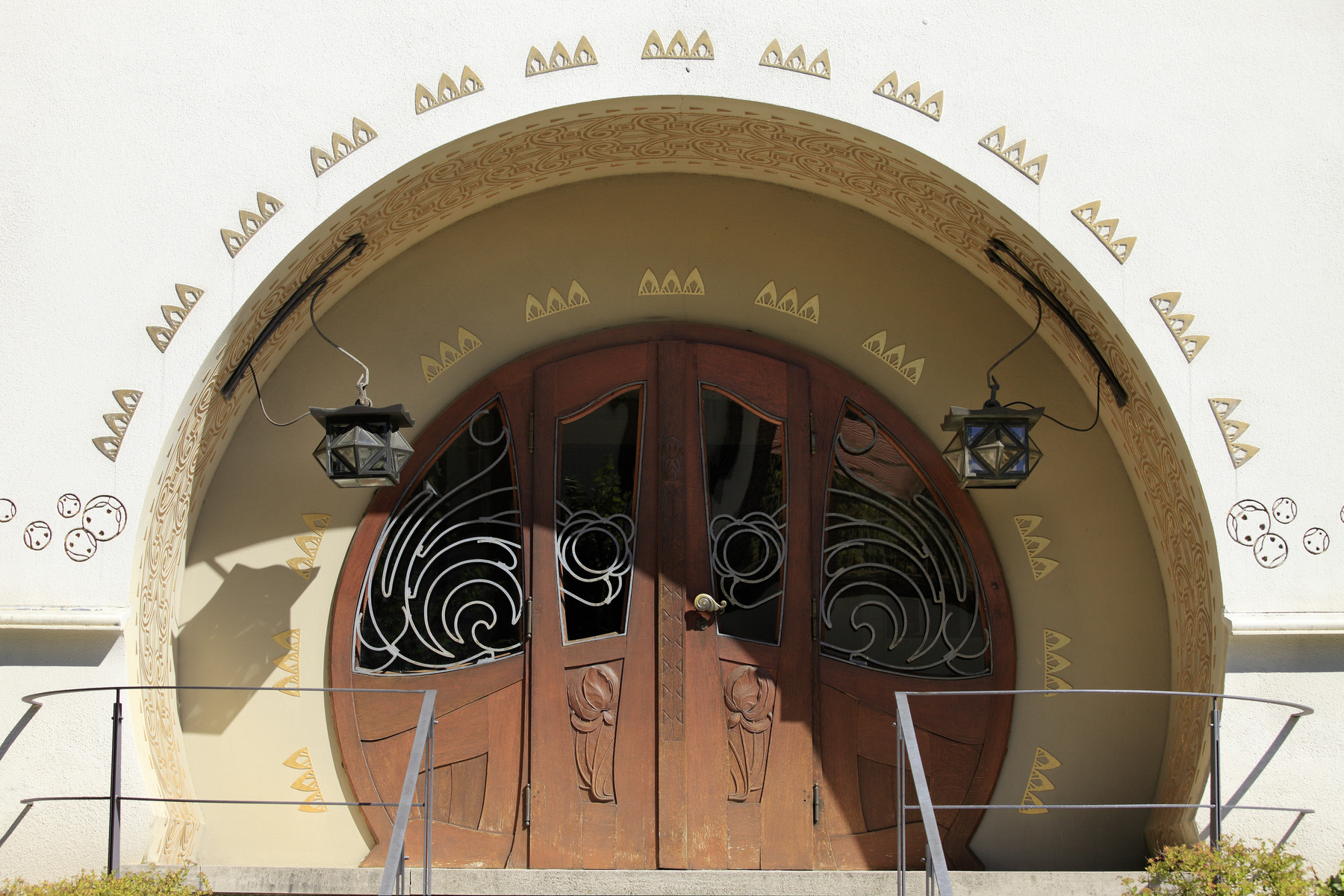 The entrance is located off the street above a small stairway. A portal shaped as an omega arch welcomes visitors with its protective reveal decorated with gilded ornaments. The slightly curved wrought-iron latticework and the transparent glass as background create a generous and friendly access by means of artistically used materials.