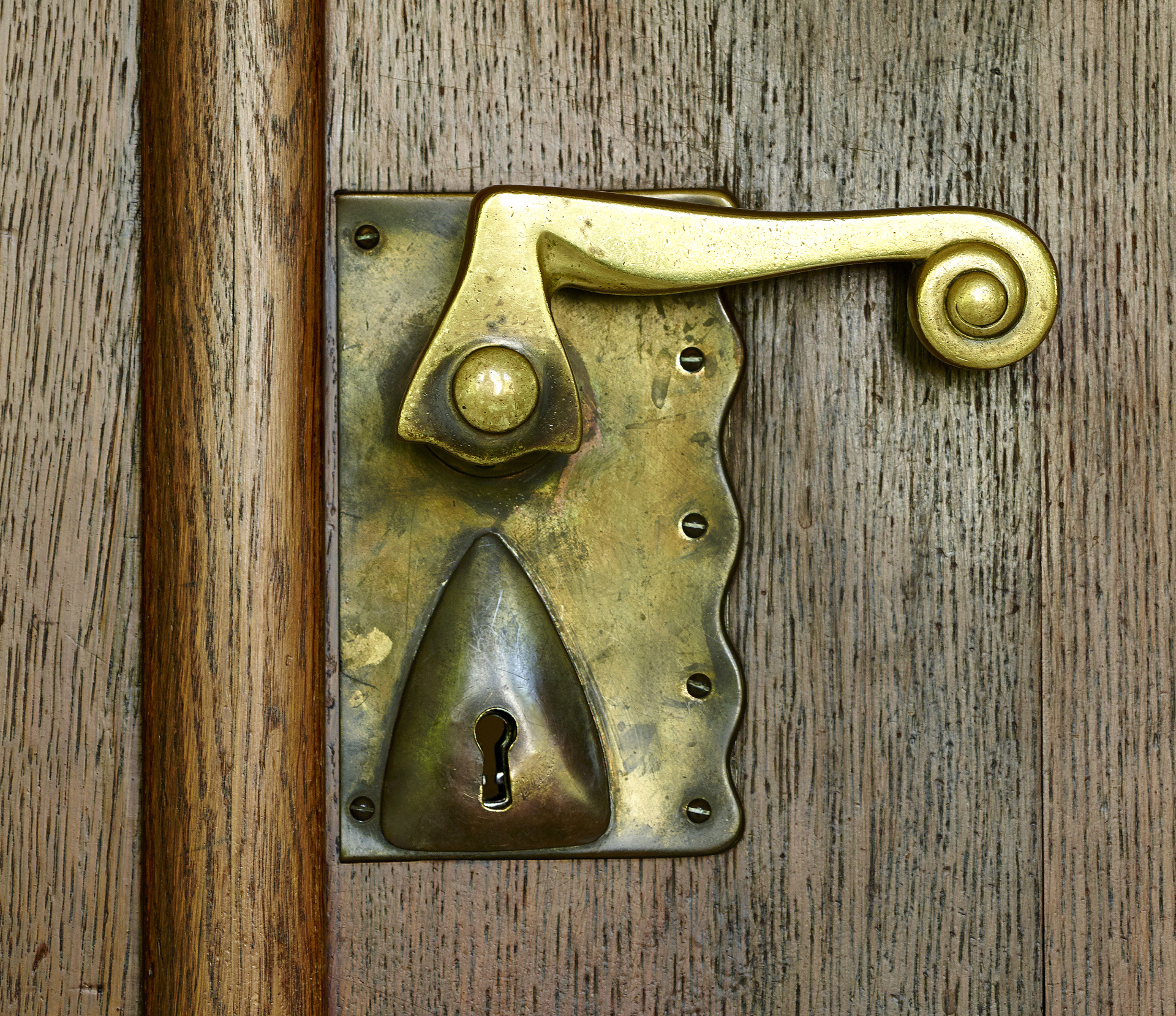 The opulent interior decoration defines the large hall as the central space of this upper middle-class villa. A broad floral ornamental motif in light blue-green and orange pastel shades covers the wall section above the fireplace. The stylised peacock feathers on both sides of the opulent decoration are fitted quite functionally with naked light bulbs. The character of this wall decoration is reminiscent of the planar motifs from the formal repertoire of William Morris or of the early wallpaper designs of the English Arts & Crafts movement.