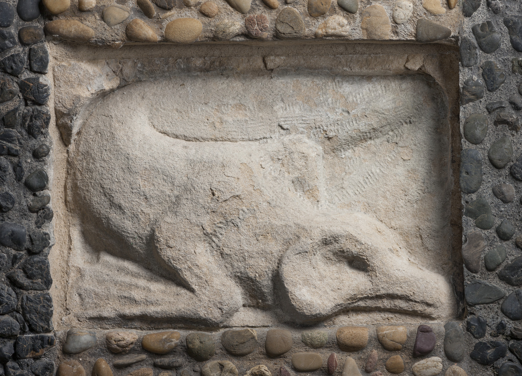 Der Bildhauer Daniel Greiner gestaltete vier in Augenhöhe gesetzte Reliefplatten aus Kunststein. Sie stellen die Wasserwesen „Krabbe“, „Das sterbende Wasserweib“, „Der Märchenvogel“ und „Der Wassergreif“ dar. Die oberen Abschlüsse der flankierenden Wandpfeiler werden von den Stadtwappen Darmstadts geziert.