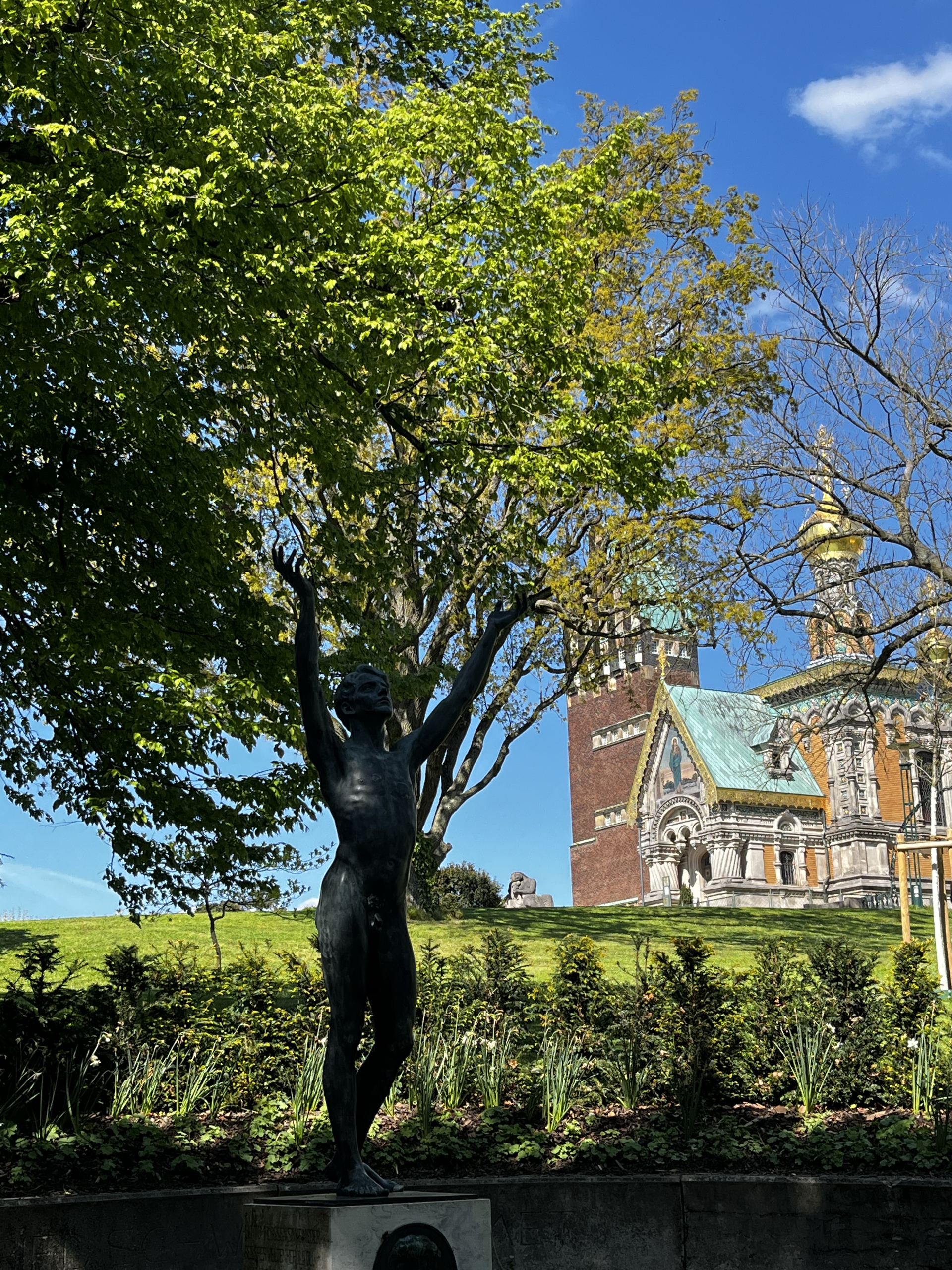 Die lebensgroße Statue der Jünglingsfigur von Ludwig Habich, ein Gründungsmitglied der Darmstädter Künstlerkolonie, befindet sich in einer kleinen halbkreisförmigen Bucht im Alexandraweg an der Ecke vom Eugen-Bracht-Weg. Die Bronzeskulptur, mit erhobenen Armen und aufwärts gerichteten Blick, ist auf einem quadratischen Sockel platziert, in dem auf der Vorderseite ein Bronzerelief von dem Dichter Gottfried Schwab befestigt ist. Drei Versen aus Schwabs Gedicht „Genius des Gesangs“ sind seitlich in dem Sockel eingraviert. Auf der Rückseite des Sockels befindet sich ein in den Stein gehauenes medaillonartiges Relief.