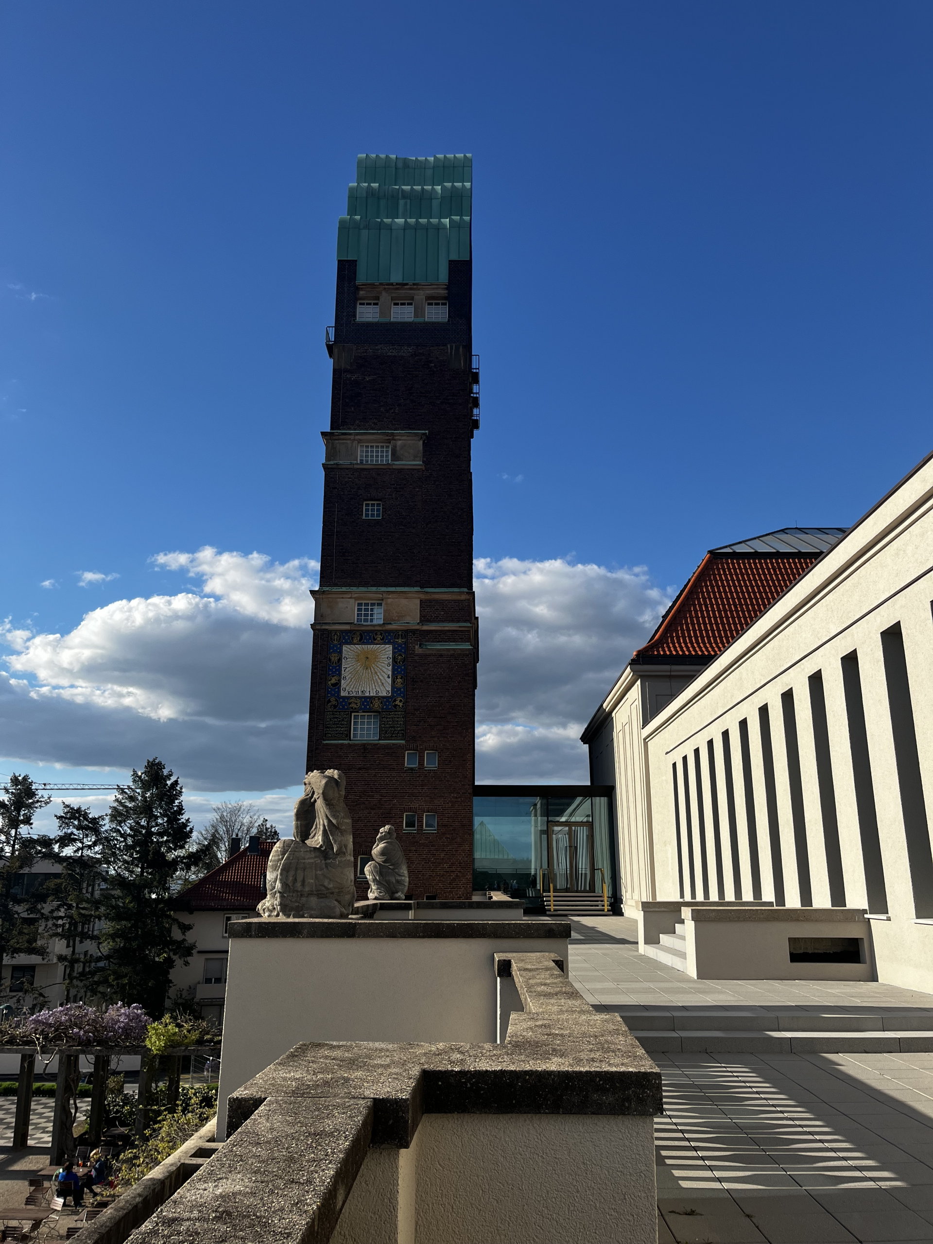 Mit seiner eigenwilligen, schlichten Form, der materialbetonten Außenhaut und den über Eck geführten Fensterbändern verweist die Architektur des Darmstädter Hochzeitsturms bereits auf die Zeit des Expressionismus.